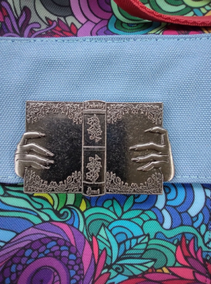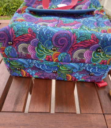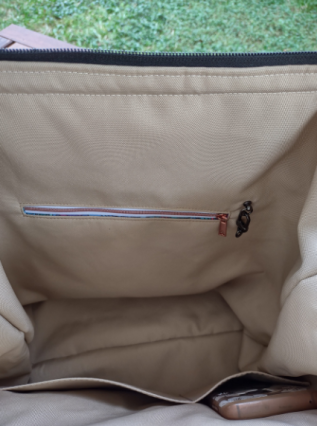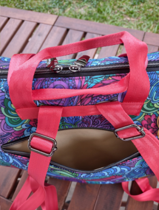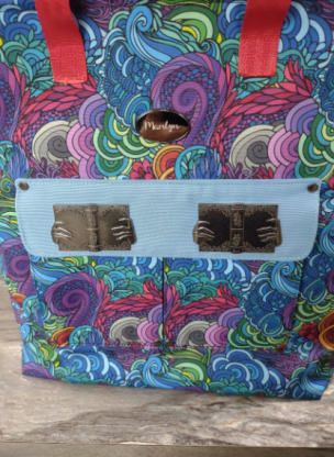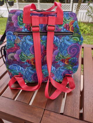 This bag has a large wide mouth opening to accomadate large books, small laptop or items you need to carry. The sturdy staps hold the load. Many items can be added to the bag like a water bottle holder, extra large pockets on front. large feet to set on etc...