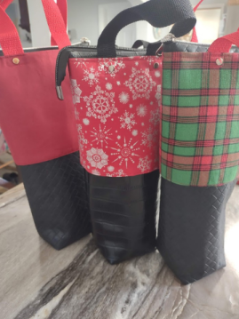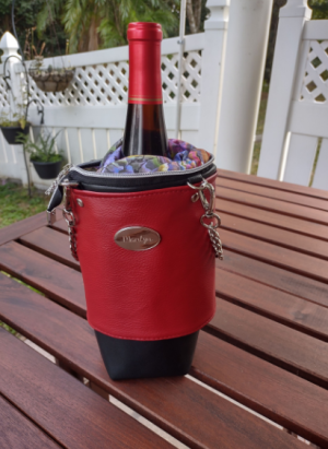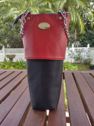 Wine bottle with a handmade bag for a gift! What a great idea! The bottom half can be made of vinyl or WPC the top has to be a light weight Cotton or WPC to allow the top to slide down.